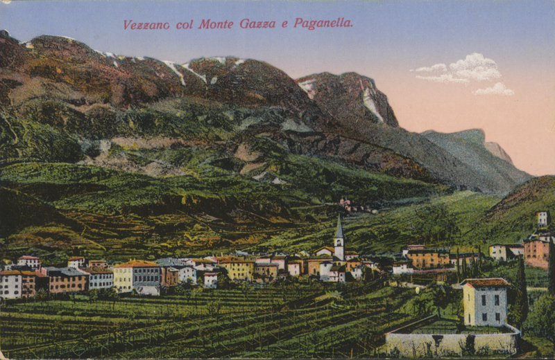 Cartolina composta da una fotografia panoramica del paese di Vezzano con sovrapposto uno scorcio della piazza. La panoramica offre una chiara visuale dell'impianto a croce del paese con le case disposte esclusivamente lungo via Roma, via Dante e via Borgo. Il particolare ci mostra la scritta bilinge italiano-tedesco sull'albergo ornato dall'insegna in ferro battuto: ALBERGO ALLA CROCE D'ORO CON GIARDINO" e "GASTHOF ZUM GOLDEREN KREUZE MIT GARTEN".