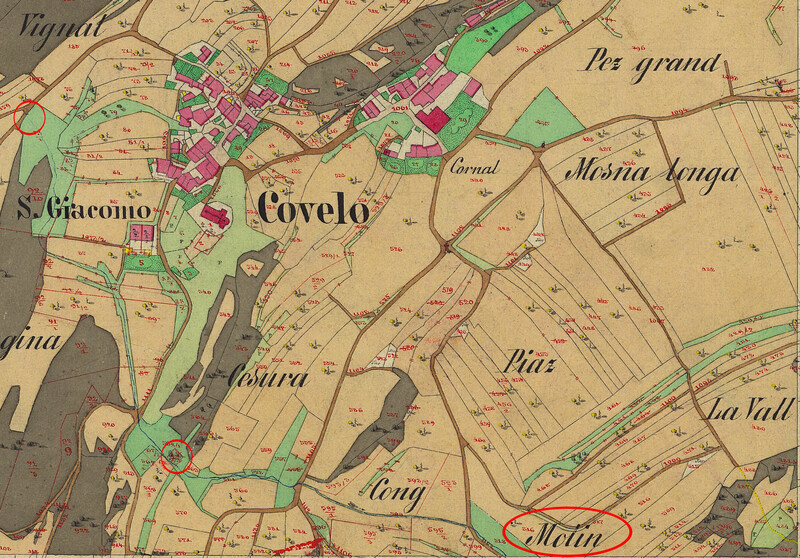 Sulla mappa del catasto austriaco del 1860 è segnata la roggia, un edificio tratteggiato che diventerà un mulino e un toponimo "Molin" al di sotto del paese. Sorgente, edificio e toponimo sono cerchaiti in rosso per rnderli immediatamente riconoscibili.