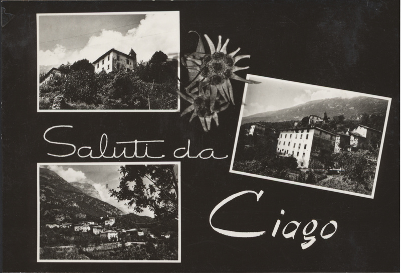 Cartolina a sfondo scuro con tre immagini del paese di Ciago, fiori decorativi e scritta "Saluti da Ciago". Uno scatto è dedicato alla panoramica del paese, in uno degli scorci si vede il campanile con davanti la canonica e si intravede la scuola, nell’altro si vedono in primo piano gli edifici che ospitavano tre dei mulini presenti un tempo in paese: Cappelletti, Eccel, Zuccatti.