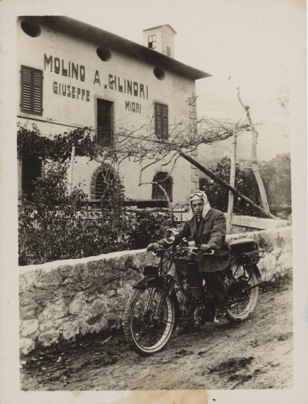 Nella fotografia è rappresentato l'edificio del molino a cilindri di Giuseppe Miori, sito in Padergnone, e Raimondo Miori, undicesimo dei sedici figli di Giuseppe Miori, su una motocicletta.