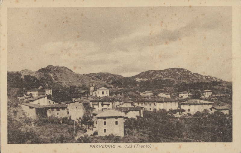 Stampa in bianco e nero 10x14,5 cm riportante sul retro scritto a mano "Fraveggio m.433 (Trentino) Panorama" ed il timbro "Foto CINE N. 9319 TRENTO".