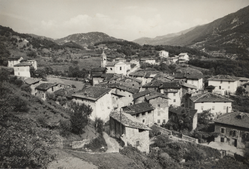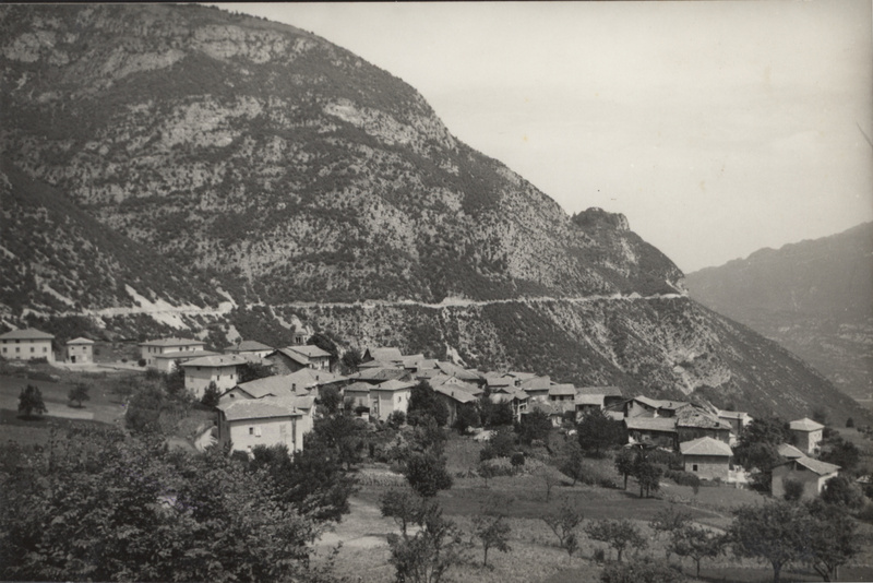 Veduta in bianco e nero di Ranzo con il monte Gazza sullo sfondo, ipoteticamente scattata dal Dain Piccolo.