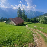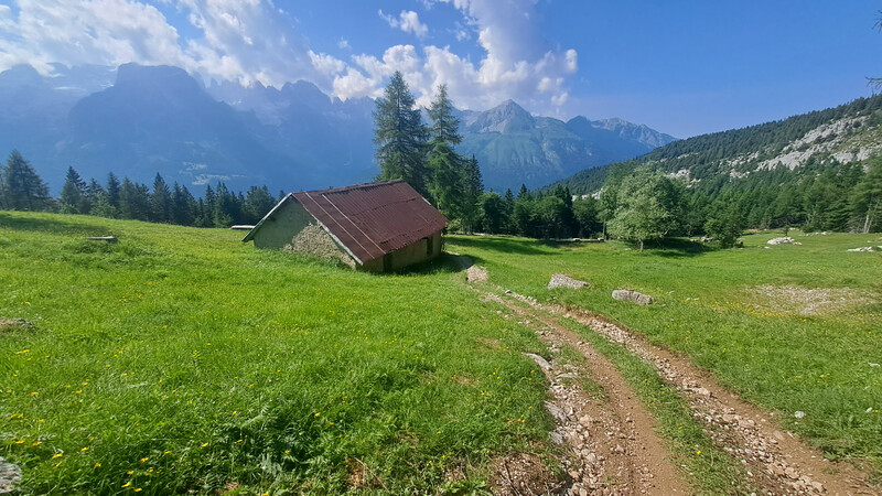 - Nella prateria intorno a quella che era la casara della malga di Ciago si possono notare le tracce della stalla. Sullo sfondo le dolomiti del Brenta.