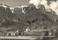 Cartolina formato 10 x 15 cm, viaggiata nel 1959 con affrancatura di 20 lire (due francobolli da 10 lire). Lo scatto è sicuramente antecedente a tale data in quanto proprio nel 1959 è stata inaugurata la scuola, edificio qui non presente. Al tempo erano ancora chiaramente visibili alcuni dei masi che sono andati a formare il paese: in primo piano il maso Canova poi sulla sinistra della strada la canonica (al tempo anche scuola) e sulla destra la chiesa, a seguire sulla sinistra il “Mas dei Toniòi” e sulla destra il “Mas dei Frati”, in cima Maso Valar. Altri masi rimangono fuori da questa inquadratura.