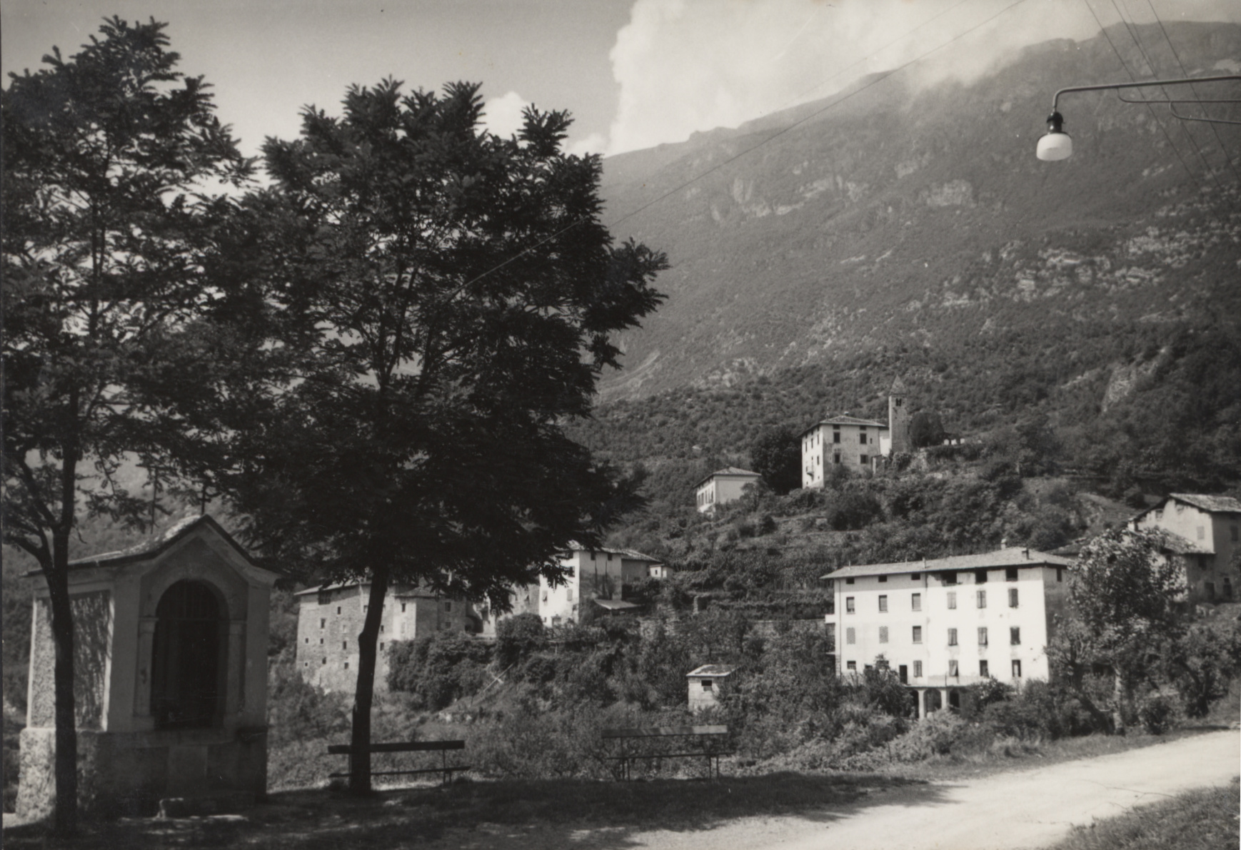 Fotografia raffigurante il capitello di San Rocco, i mulini Cappelletti, Eccel e Zuccatti, la scuola, la canonica e la Chiesa di San Lorenzo. La datazione è stimata in base al confronto con altre cartoline.