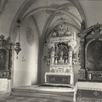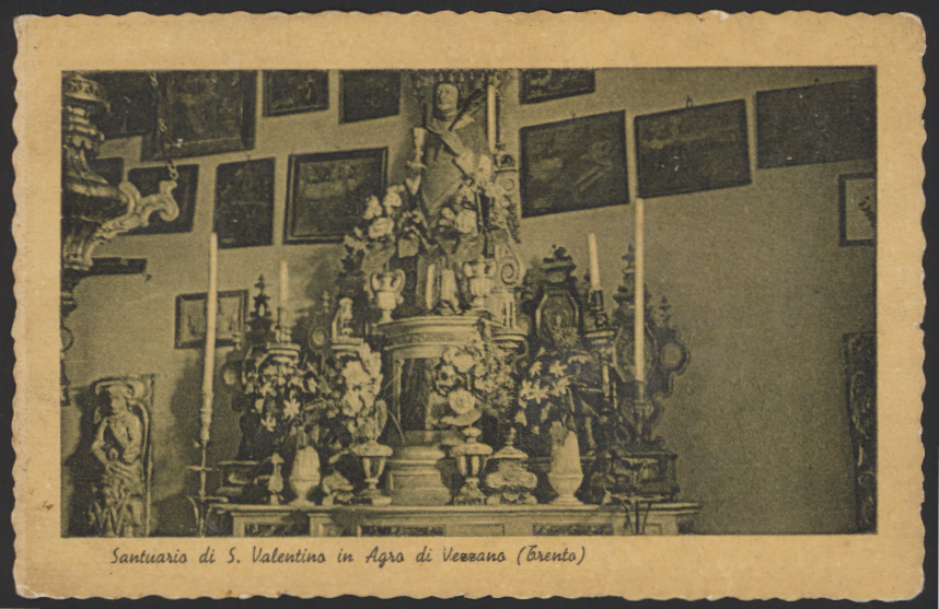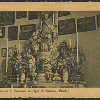 - Foto dell'altare dedicato a S. Valentino all'interno del santuario di San Valentino in Agro. Sulla parete di fondo erano allora presenti numerosi quadri ex voto. Pur non essendo viaggiata, il formato 9x14 cm, con cornice bianca e bordo dentellato ci porta a presumere una datazione precedente al 1945.