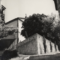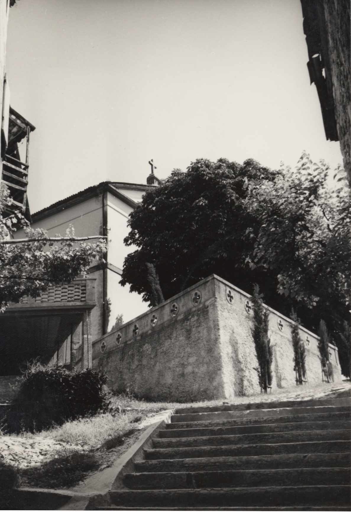 Nella foto è rappresentata parte della scalinata di accesso alla chiesa di Ciago con le mura esterne del sagrato e lo spigolo sinistro della chiesa. Si notano all'esterno delle mura tre cipressi e all'interno del sagrato due ippocastani. Sul lato sinistro si nota parte di un edificio privato con una pergola e un ballatoio alla trentina.