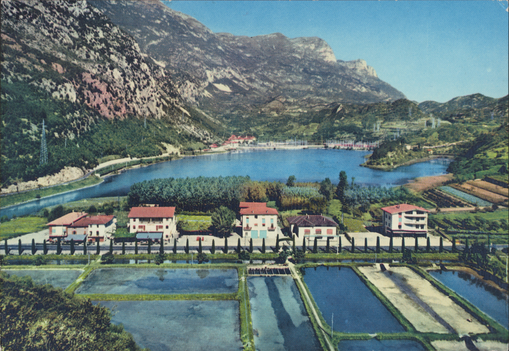 In primo piano la troticoltura e sullo sfondo il lago di Santa Massenza.