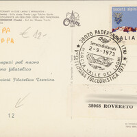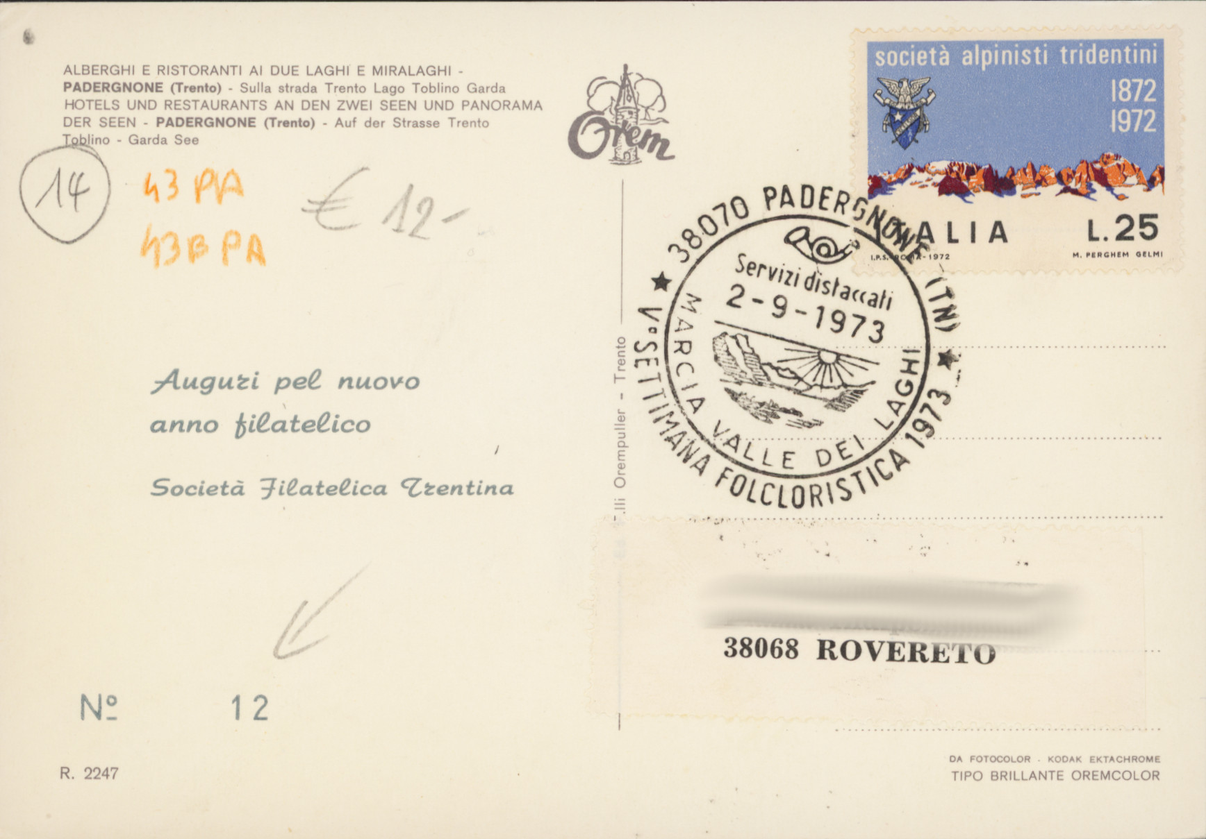 Il francobollo da 25 lire è vidimato da un timbro riportante la dicitura " 38070 Padergnone (TN) - V^ settimana folcloristica 1973 - Marcia Valle dei Laghi - Servizi distaccati 2-9-1973".