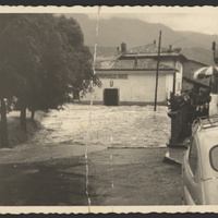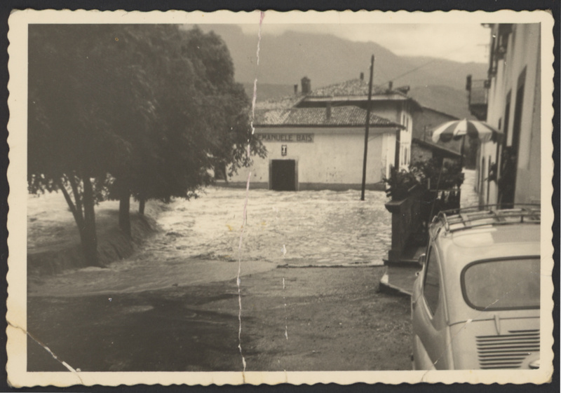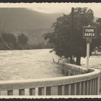 - Le due fotografie rappresentano il fiume Sarca in piena, presso la località Salvetta di Sarche. Entrambe sono riprese dal ponte sul fiume, nella prima è in evidenza il particolare del vecchio ponte mentre nella seconda si vede in primo piano la tabaccheria Emanuele Bais e sulla destra l'albergo all'Angela.
