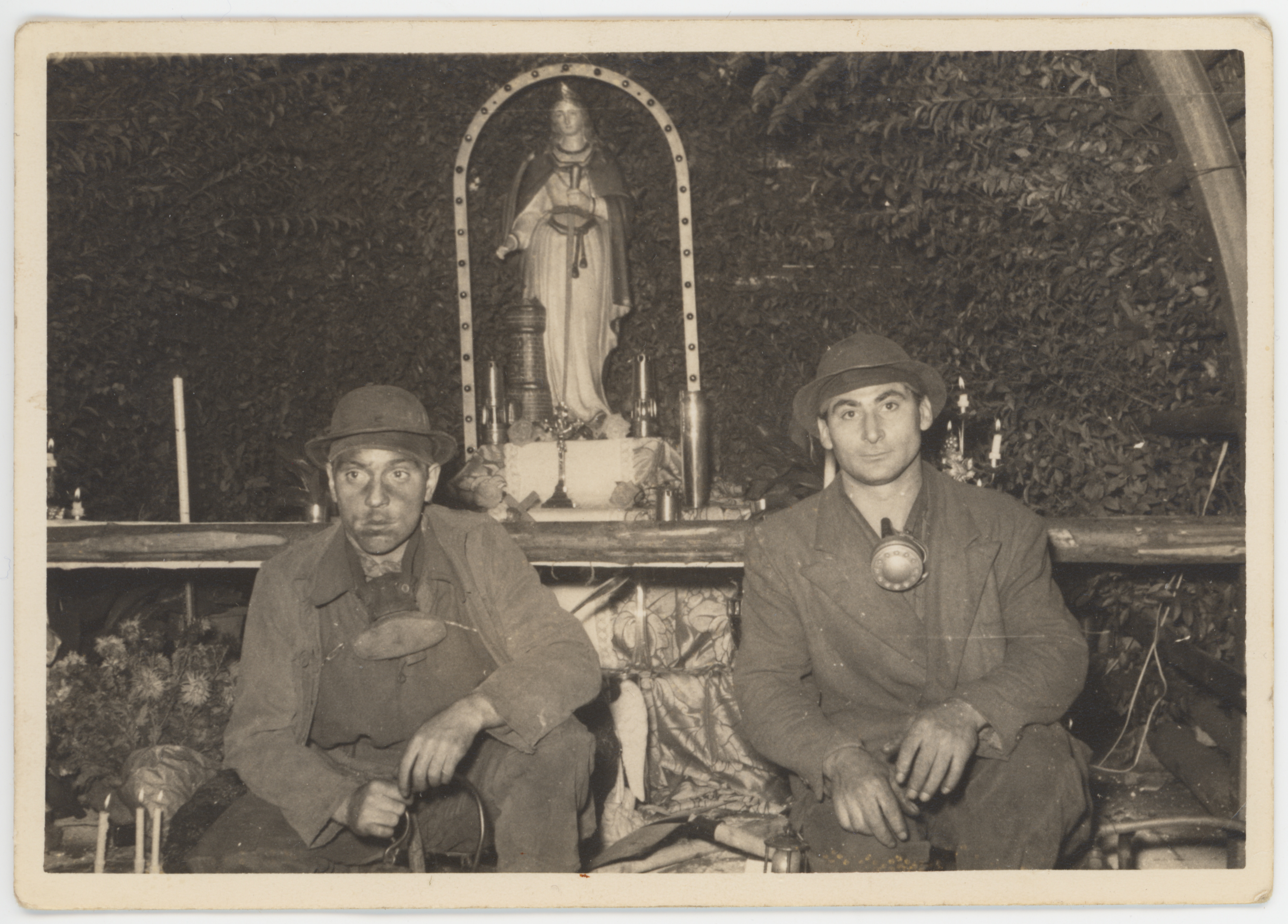 Leo Daldoss, con un altro minatore presso la statua di Santa Barbara, all'interno della miniera della Societe Anonyme des Charbonnages du Gouffre Chatelineau in Belgio.
