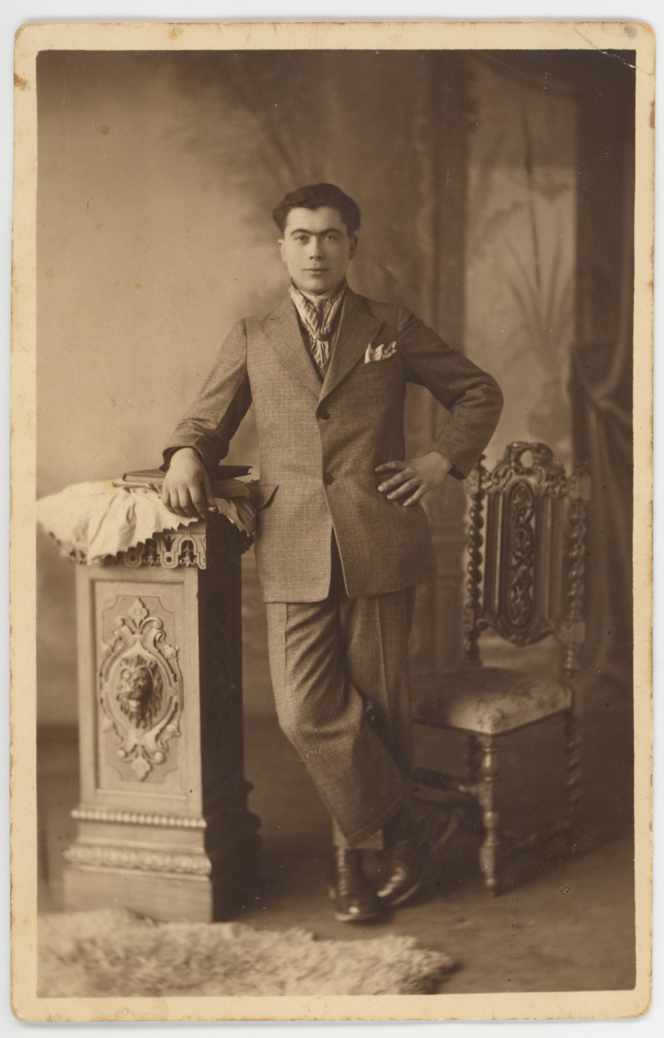 Alessio Sommadossi, classe 1906, di Ranzo, emigrato in Belgio, fa dal fotografo questo ritratto a figura intera, così da mandare un ricordo ai familiari. Sul retro è formato cartolina.