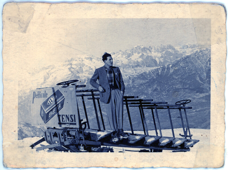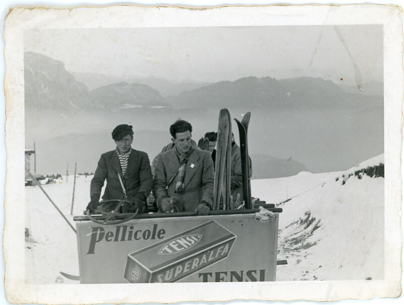 In questa foto vediamo la slitta con la pubblicità delle pellicole Tensi. Sullo sfondo il monte Gazza ed il Brenta.