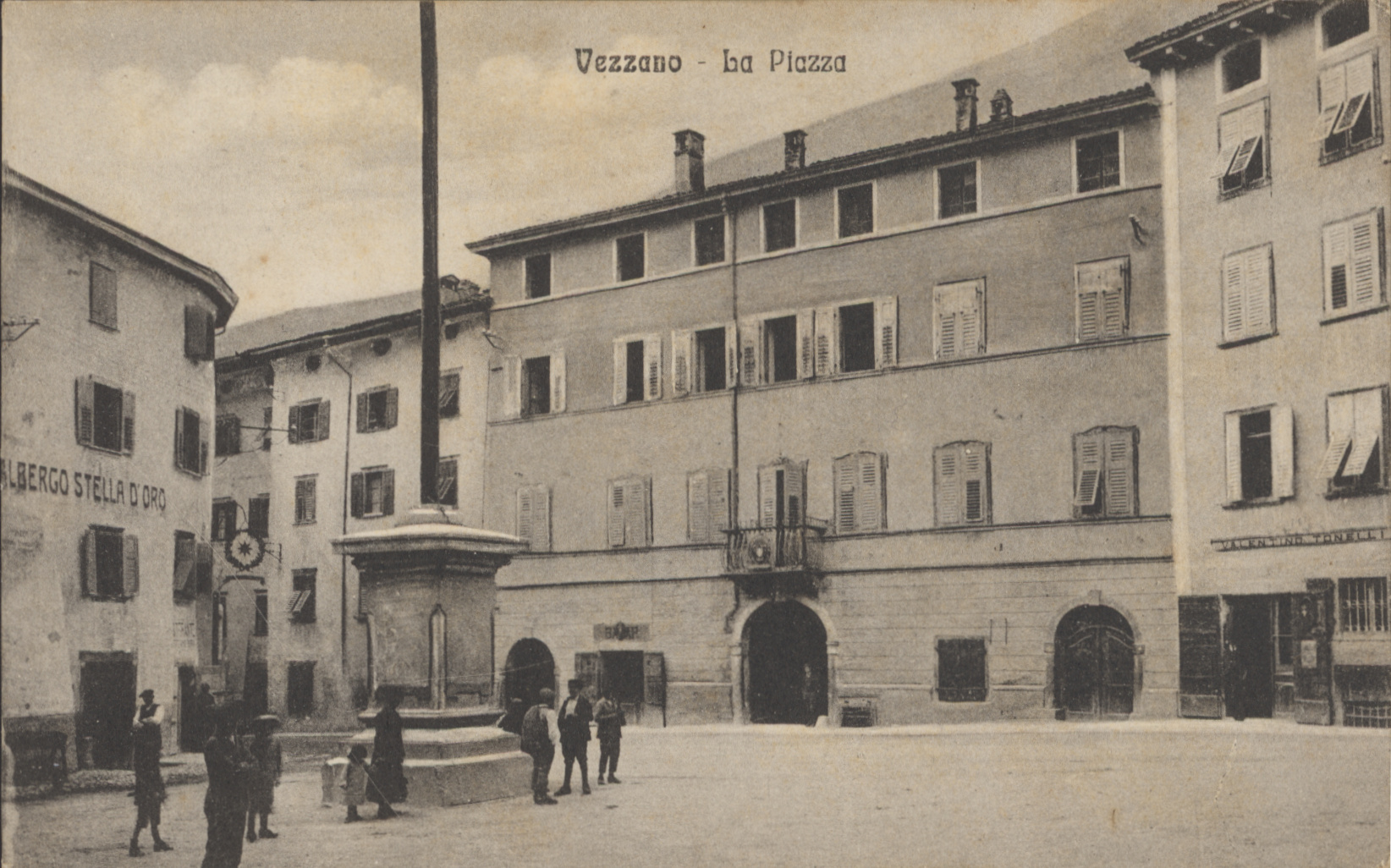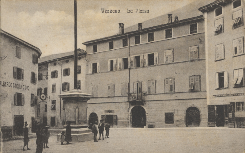 Vi è la presenza dell'albergo Stella d'oro ma non del Croce d'oro, anzi sembra di scorgere lo stemma sabaudo sul poggiolo e un militare sul portone di quell'edificio, per cui la si data dopo il 1918, ma visto l'abbigliamento delle persone, non tanto dopo.
