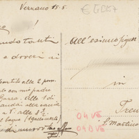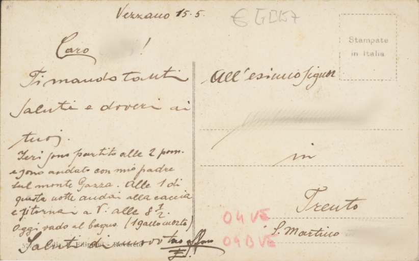- In questa copia, viaggiata, abbiamo uno spaccato di vita. Il mittente scrive: "Ieri sono partito alle 2 pom. e sono andato con mio padre sul monte Gazza. Alle 1 di questa notte andai alla caccia e ritornai a V. alle 8 1/2. Oggi vado al bagno (1gallo morto)."